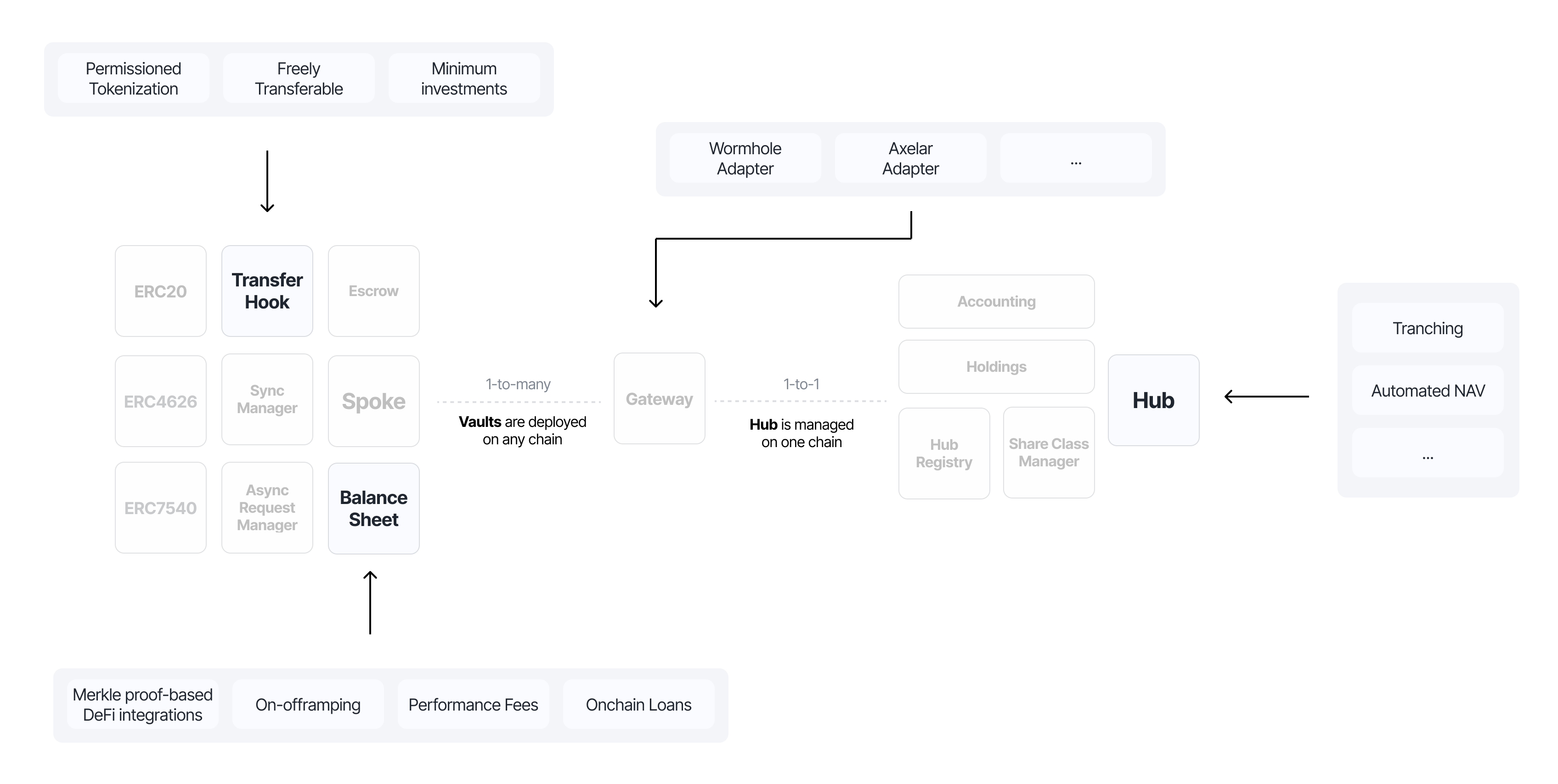Adapters route cross-chain messages via the Gateway contract, maintaining a 1-to-many relationship between a single hub on one chain and many vaults.